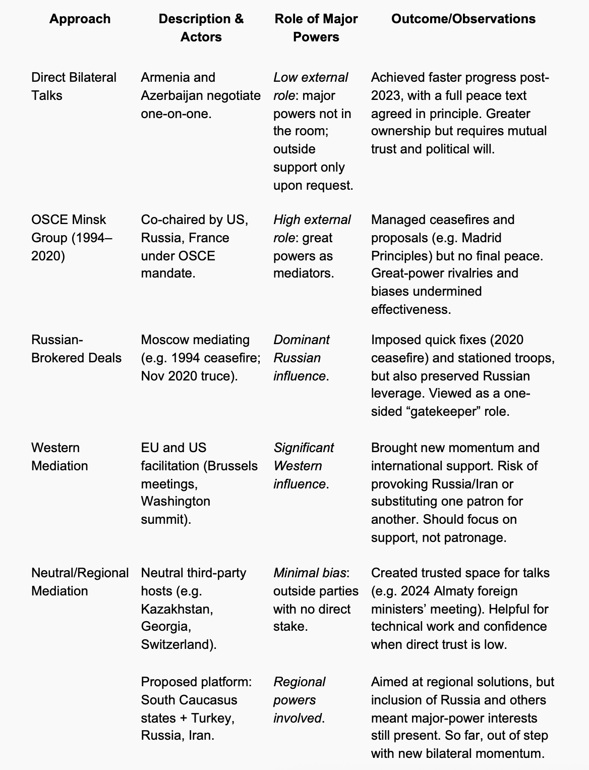 For decades, negotiations between Armenia and Azerbaijan followed a multilateral framework. Considering that there was not huge success in such framework it proved to be problematic due to several factors: 1. the fragmented interests of external mediators, 2. the lack of direct accountability between Armenia and Azerbaijan themselves. Mediators were approaching the peace process through the lens of their own geopolitical rivalries, Russia seeking influence in the South Caucasus, Western states wishing stability but with no leverage.